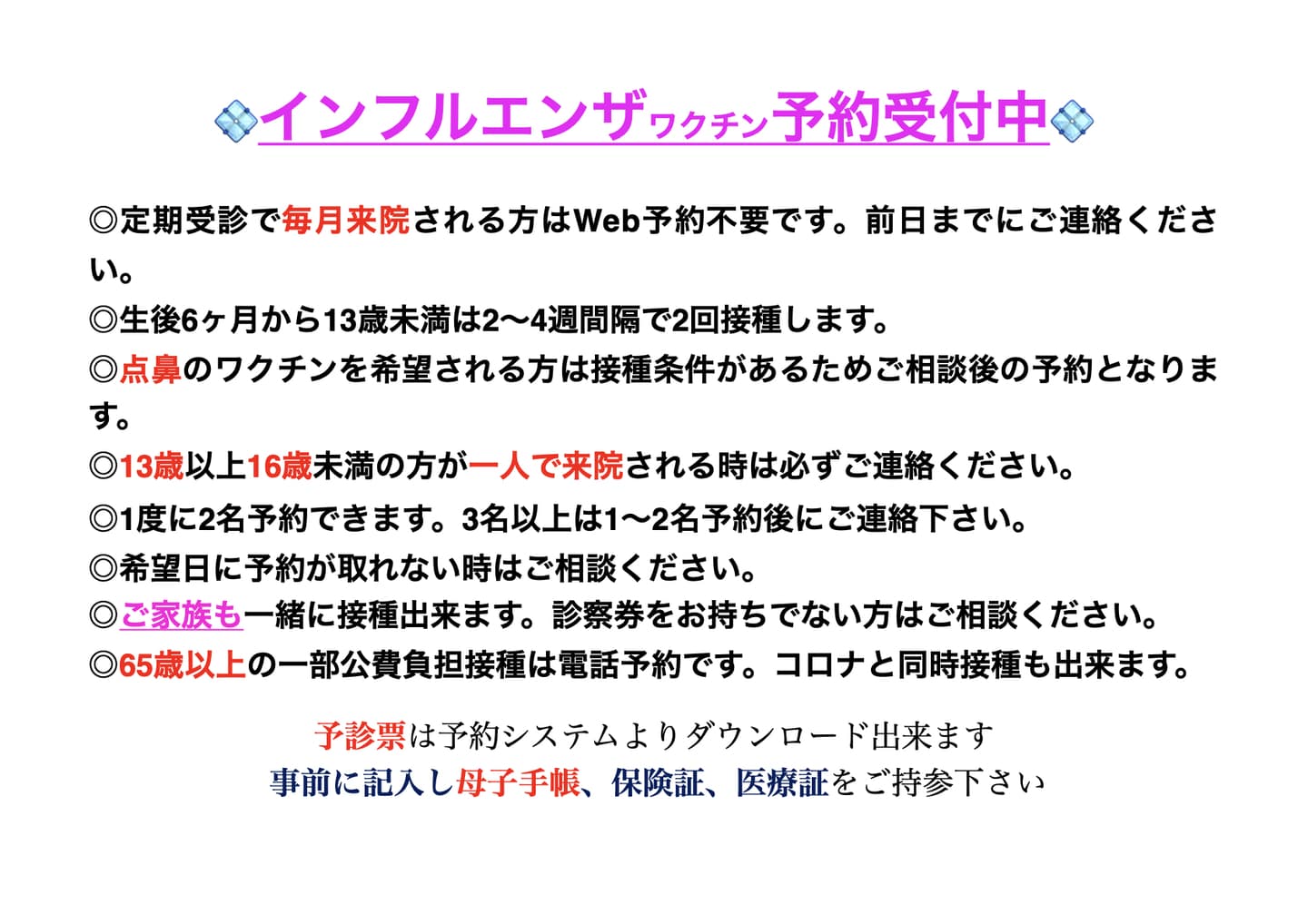◎65歳以上の一部公費負担接種は電話予約です。コロナと同時接種も出来ます。